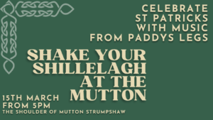 - St Patricks Night with Paddys Legs15th March from 5pm St Patricks is will soon be here. This year we will be celebrating with Paddy’s Legs & their toe tapping Irish… Read more: St Patricks Night with Paddys Legs