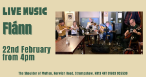 - Sunday Sounds – Flánn22nd February from 4pm The popular Irish folk band are back at The Mutton for an afternoon of toe tapping live music