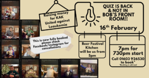 - Pub Quiz!16th February – 7pm for 730pm start – This Fully Booked Nominated Charity :- KAK United Against Leukaemia. The link is below if you’d like… Read more: Pub Quiz!