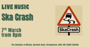 - Live Music – Ska Crash7th March from 8pm SkaCrash – party tunes; ska music from the sixties to eighties plus other other dance songs, ska-ified