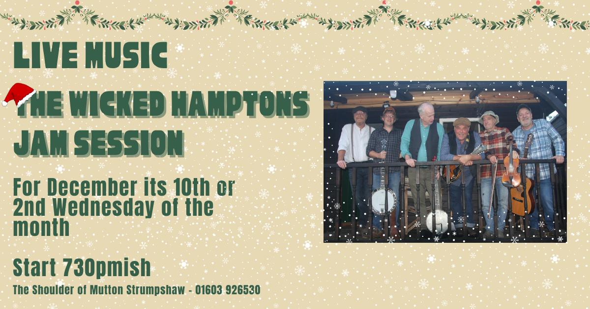 For December The Wicked Hamptons will be with us on 10th, not the first Wednesday of the month. It’s a Jam Session & you are most welcome to join in. Enjoy an eclectic mix of Folk, Norfolk Swamp Music with a modern twist.