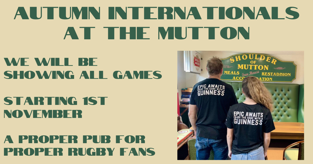 Autumn Internationals 2025 Share: Web: All Games Being Shown Watch all of the Autumn internationals here at The Mutton, starting with England v Australia Saturday 1st Nov 3.10pm KO If you have a preferred table, booking is advisable, please call 01603 926530