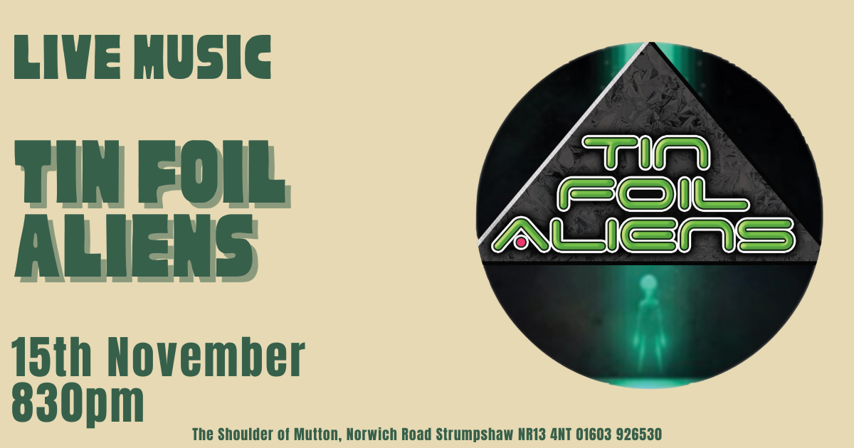 It is a first for us, introducing the Tin Foil Aliens. Tin Foil Aliens are a 5 piece band from the East of England performing self-penned original material & one or two covers by artists such as Tom Petty, David Bowie & Del Amitri. & Bob one of the band members is the very talented sign maker who made our pub sign!