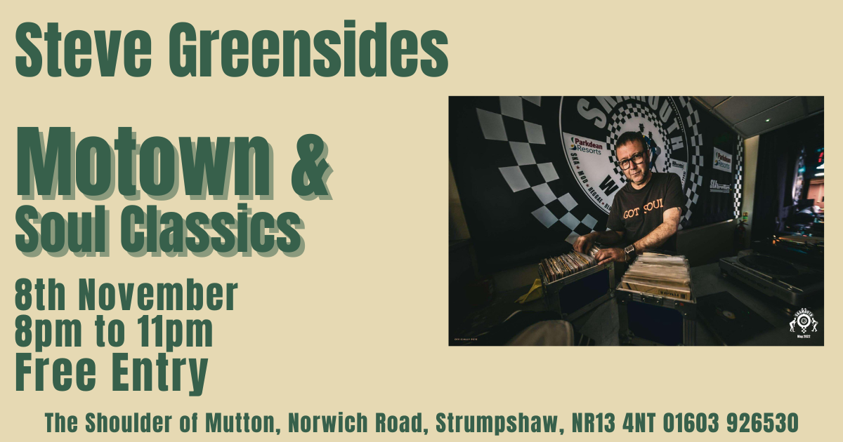 Motown & Soul Classics with Steve Greensides Share: Web: 8th November 8pm to 11pm – Free Entry Steve is back! Come & enjoy the sounds of Motown & Soul Classics with the renown Steve Greenside. We are going to make room so you can show us your moves. This will be a brilliant night.