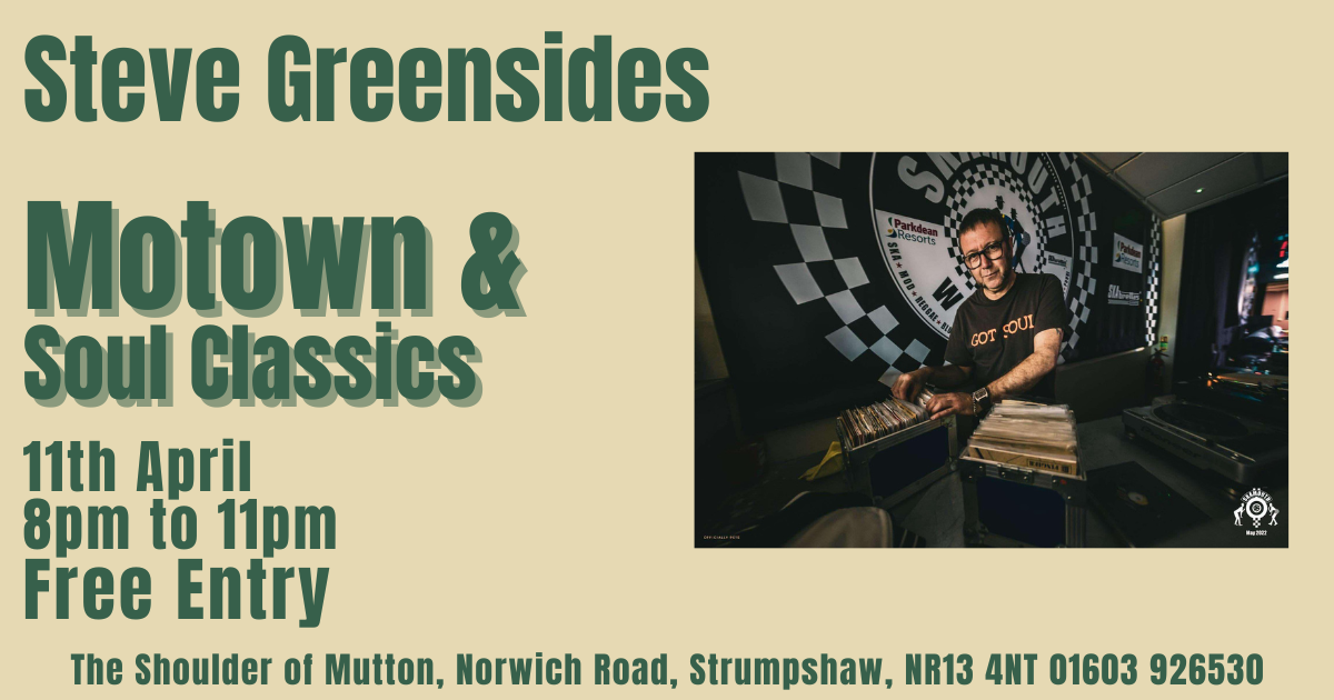 Motown & Soul Classics with Steve Greensides Share: Web: 11th April 8pm to 11pm – Free Entry Steve is back! Come & enjoy the sounds of Motown & Soul Classics with the renown Steve Greenside. We are going to make room so you can show us your moves. This will be a brilliant night.