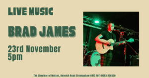 - Sunday Sounds – Brad James23rd November from 5pm Brad is back! A solo musician with a great voice playing a fantastic music.