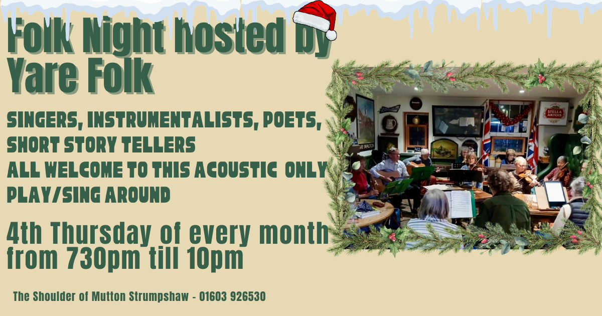 Folk Night – Hosted by Yare Folk Share: Web: For December it will 18th December 730pm to 10pm Calling all singers, instrumentalists, poets, short story tellers. You are all welcome to this acoustic only play/sing around